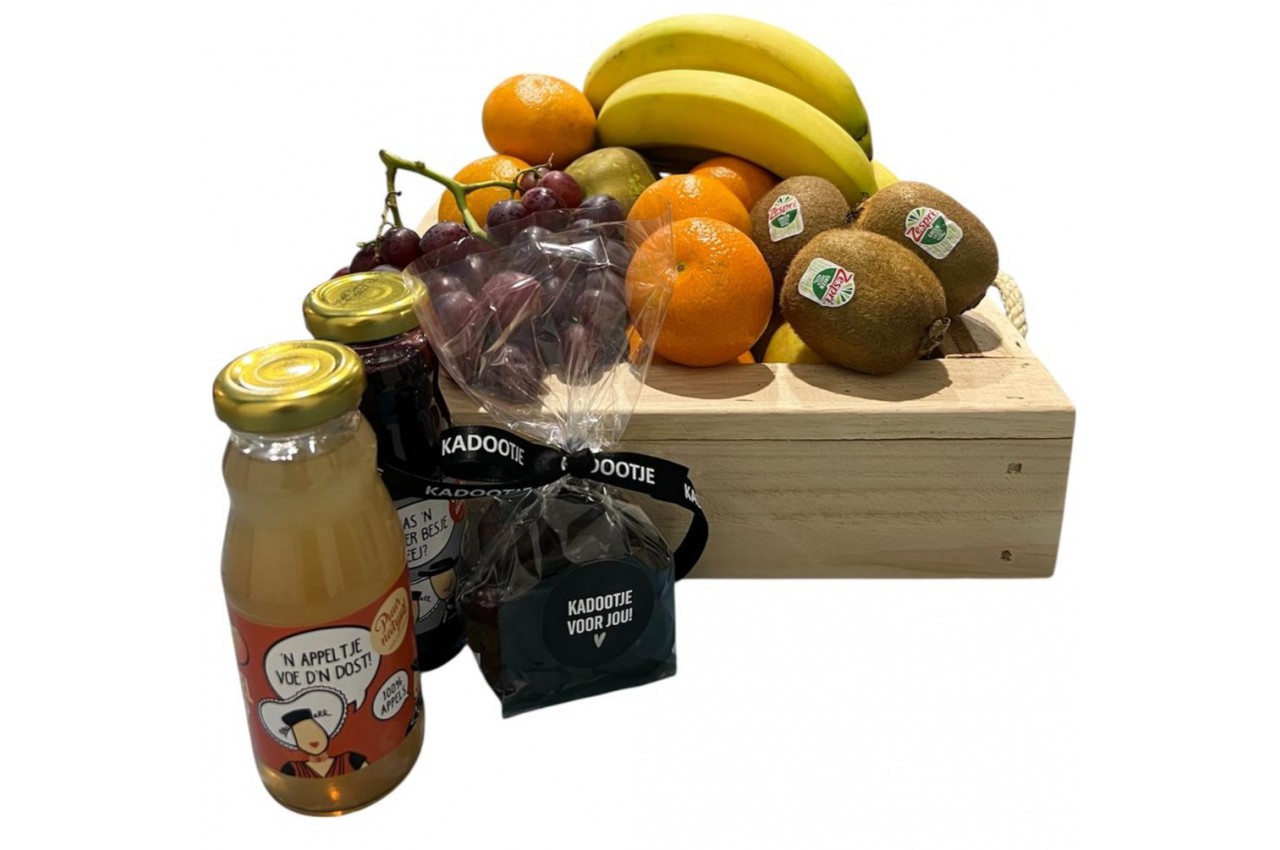 Ingepakt fruitkistje gevuld met vers fruit, twee sapjes en een zakje snoep. Het kistje is ingepakt en kan aangevuld worden met een persoonlijke boodschap.