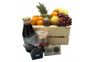 Ingepakt fruitkistje gevuld met vers fruit en een fles sap, reep chocolade en wafeltjes. Het kistje is ingepakt en kan aangevuld worden met een persoonlijke boodschap.